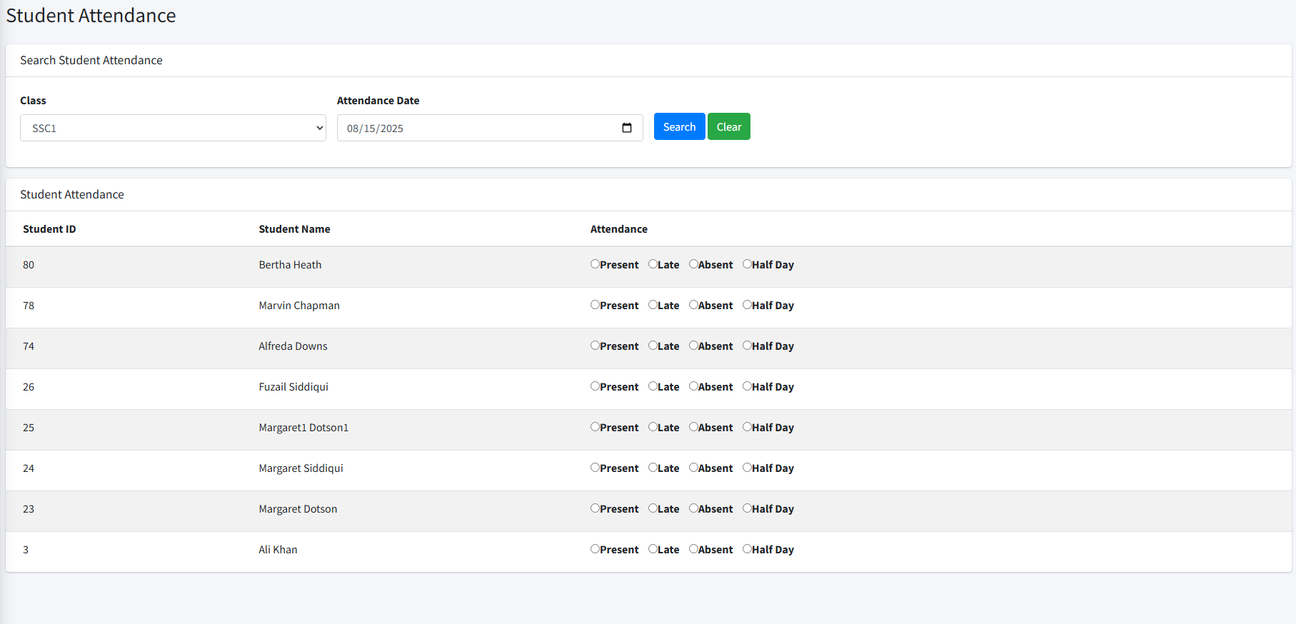 Record daily attendance quickly with options for marking present, absent, or late. Attendance records are automatically stored and can be viewed anytime by Admins, Teachers, Students, and Parents. Generate detailed attendance reports over specific periods and export them to Excel for compliance and record-keeping purposes.