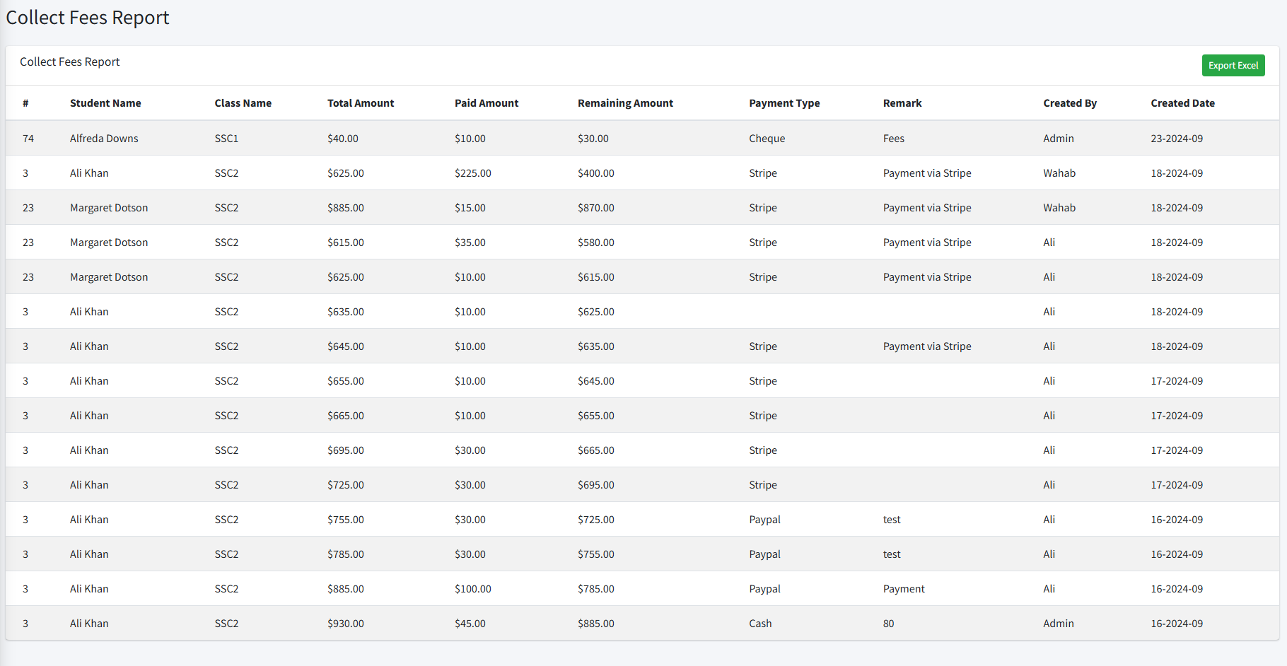 Manage all fee-related operations in one place. Students and Parents can check pending amounts, pay securely through PayPal or Stripe, and receive instant digital receipts. Admins can generate detailed reports of collected and pending fees, filter by class, student, or date, and export data in Excel for audits or offline record-keeping.