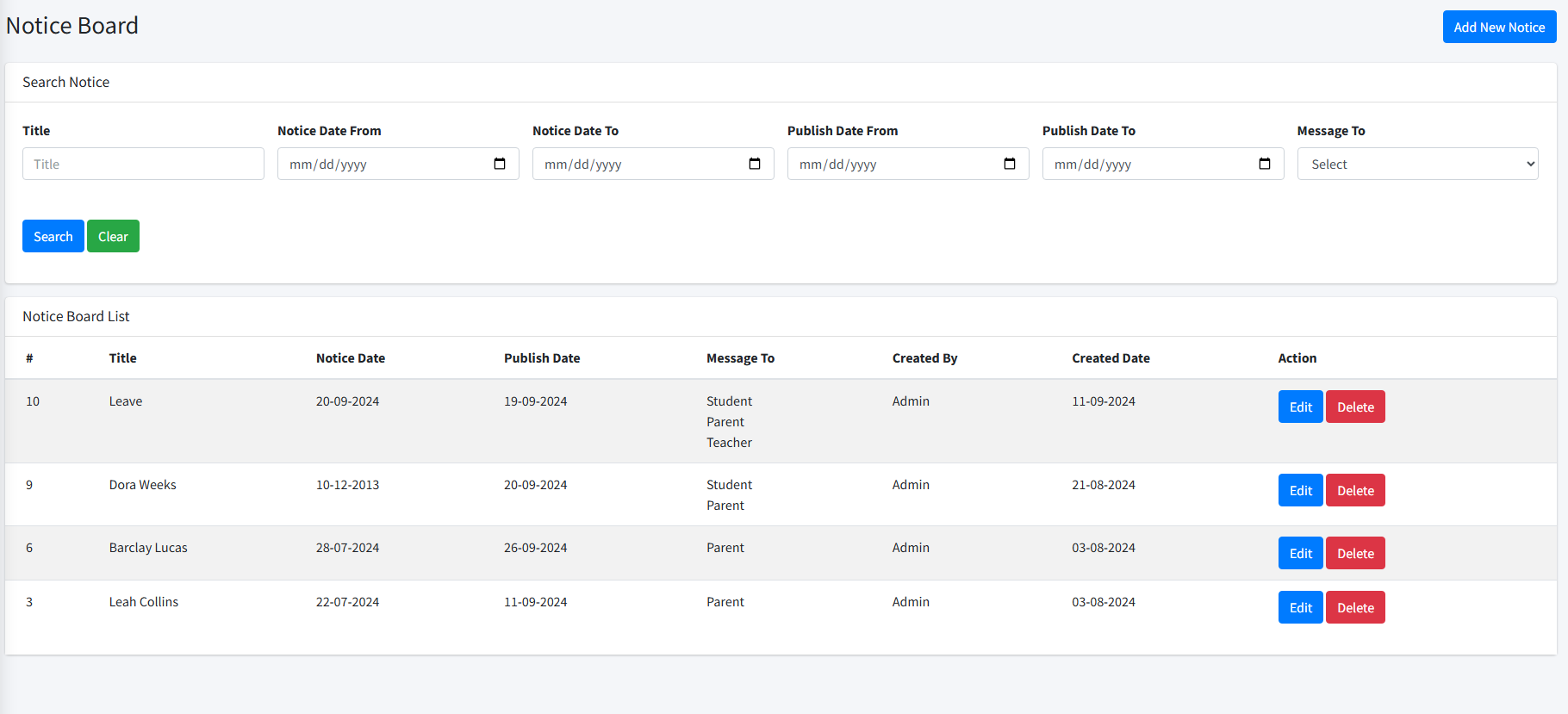 Keep everyone informed with our built-in Notice Board and email communication system. Post school-wide or class-specific announcements with attachments and expiry dates. Use SMTP email integration to send instant notifications, reminders, newsletters, or urgent alerts to any user group, ensuring smooth and effective communication.