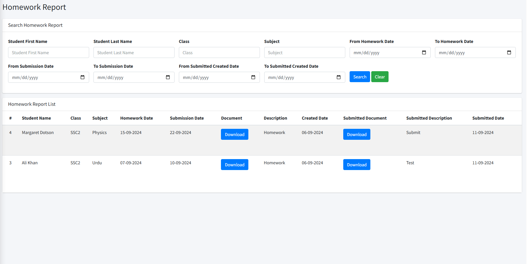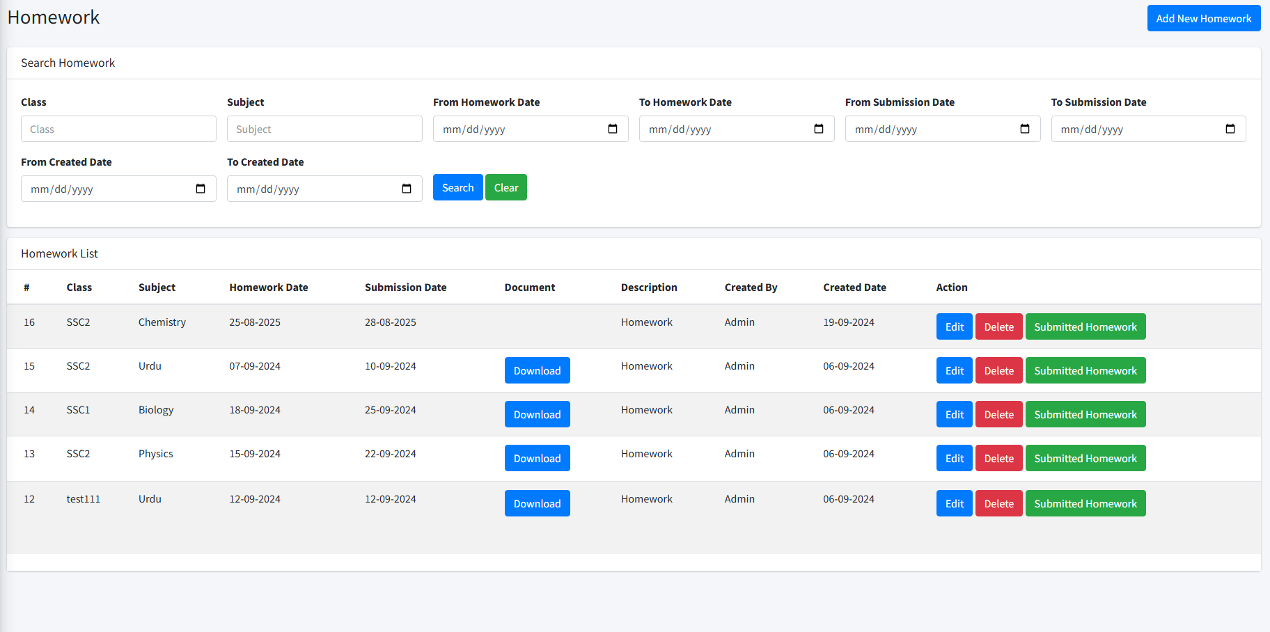 Easily generate and export records in PDF or Excel format. This includes user lists, fee statements, attendance logs, homework reports, and academic performance summaries. These exports are ideal for backups, audits, presentations, and sharing with stakeholders, ensuring important information is always accessible when needed.